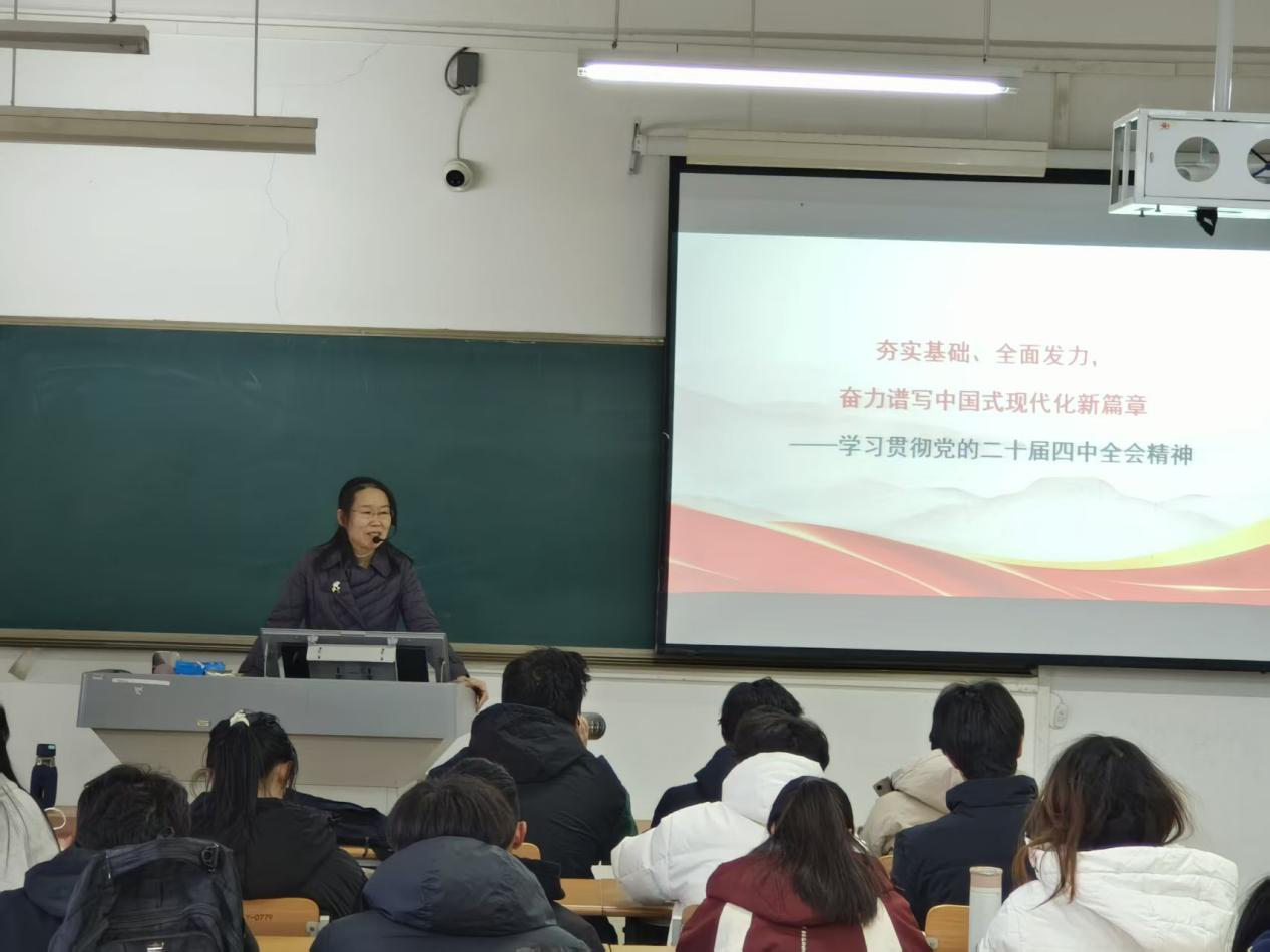 会上,宋老师从党的二十届四中全会内涵、习近平总书记对“十五五”规划编制的重视、“十四五”时期发展成就、党的二十届四中全会擘画的未来蓝图、贯彻落实党的二十届四中全会精神的实践路径五个方面展开,系统解读全会精神。她聚焦勇担“十五五”现代化新使命,勉励青年学子以党的二十届四中全会精神为指引,号召同学们将个人规划融入国家大局,以青春之我为民族复兴铺路架桥。