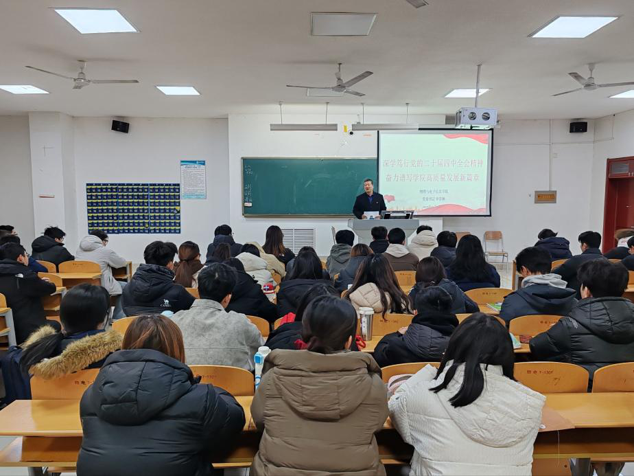 12月2日,太阳网集团tcy8722党委书记申青林以“深学笃行党的二十届四中全会精神,奋力谱写学院高质量发展新篇章”为主题,为全体党员及入党积极分子宣讲党的二十届四中全会精神。
