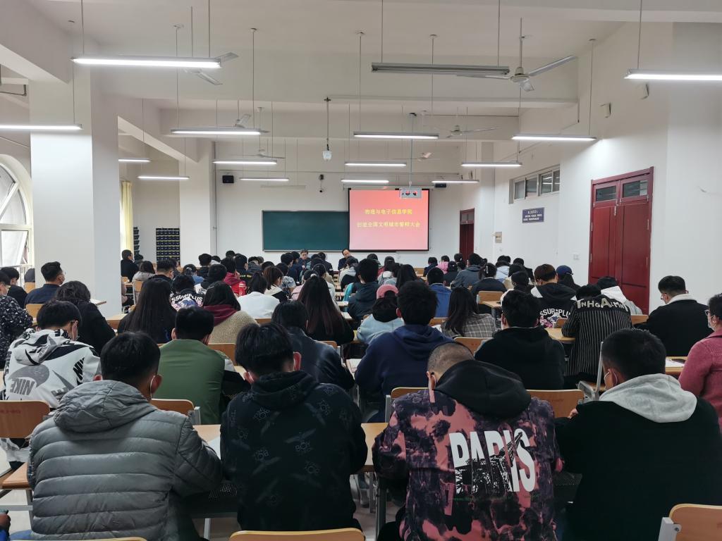 为推进全国文明城市创建工作,动员广大师生参与到文明城市创建工作中来。3月15日,太阳集团tcy8722在明理楼举行创建全国文明城市誓师大会。会议由赵庆福书记和刘汉平院长共同主持,太阳集团tcy8722全体老师和班干部参加大会。