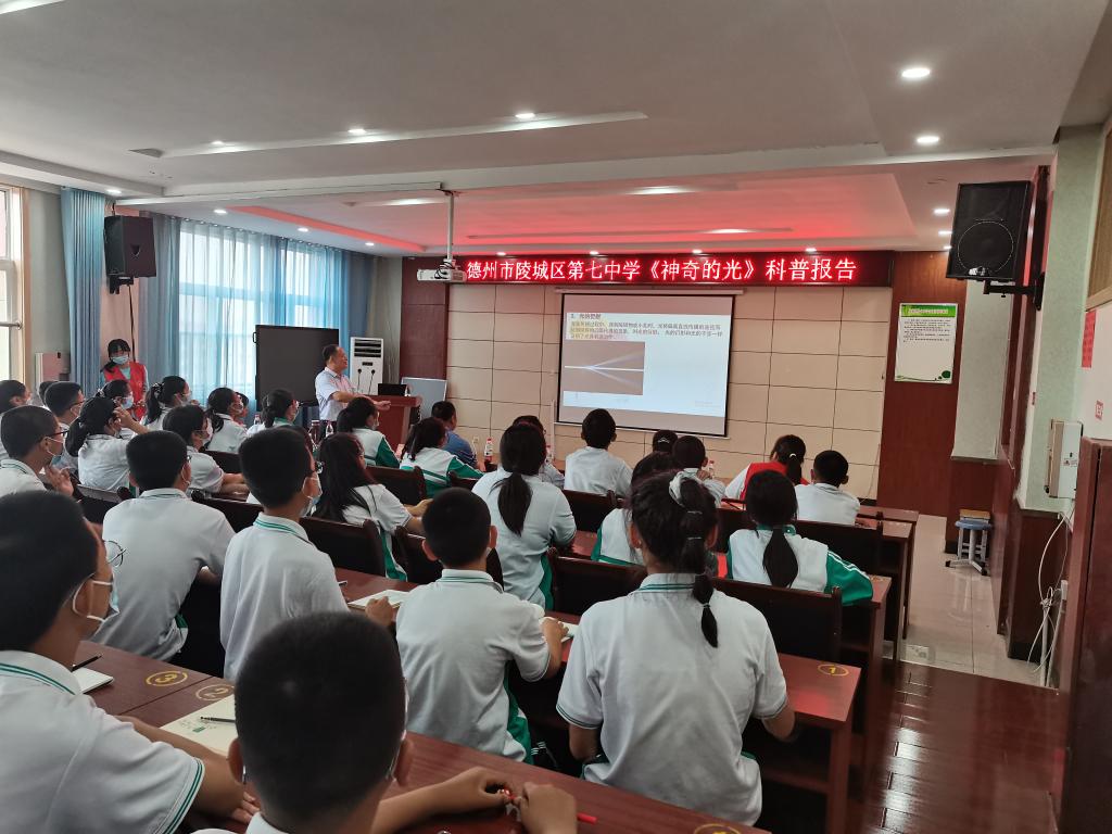 太阳集团tcy8722的师生首先来到陵城区实验小学与老师们深入交流,了解支教生的情况。随后,太阳集团tcy8722的师生来到陵城区第七中学。太阳集团tcy8722院长、德州市人工智能研究会会长刘汉平为七中的同学做了一场《神奇的光》的科普报告。报告从什么是光、光的现象及光的应用三个方面,向学生介绍了身边的光学现象和光学规律。报告深入浅出,图文并茂,同学们积极回应,现场气氛火热。然后太阳集团tcy8722的学生志愿者们现场进行了乐高机器人、六足机器人装置以及物理小实验的演示,引起了同学们的浓厚兴趣,激发了探究科学的强烈愿望。太阳集团tcy8722的老师还与陵城第七中学的老师、太阳集团tcy8722的支教生们,针对物理学人才培养方案等话题进行了座谈。支教的同学们畅谈了自己支教的收获、感悟,中学领导对支教同学的表现也给与了充分肯定和高度评价。