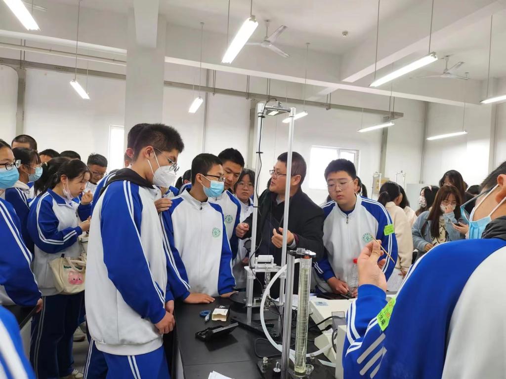 本次来参观的中学生共30余人,对于这次参观他们显得无比兴奋,对看到的仪器设备充满好奇。在近代物理实验室、光学实验室、大学物理实验室,同学们都驻足观看,聆听实验室负责老师的讲解,特别是对空气热机表现出很高的兴趣。在中学物理教法实验室,物理学专业的师范生作为志愿者,为九中的同学们展示了自己制作的多种物理仪器设备,同学们也跟随志愿者的讲解参与到实验中,围着志愿者提问自己感兴趣的问题,现场气氛融洽热烈。之后,九中的同学们还参观了学院电子设计、创新竞赛等实验室,观看自制的优秀竞赛作品。这些来访的中学生们每个人脸上都挂着收获知识的喜悦。