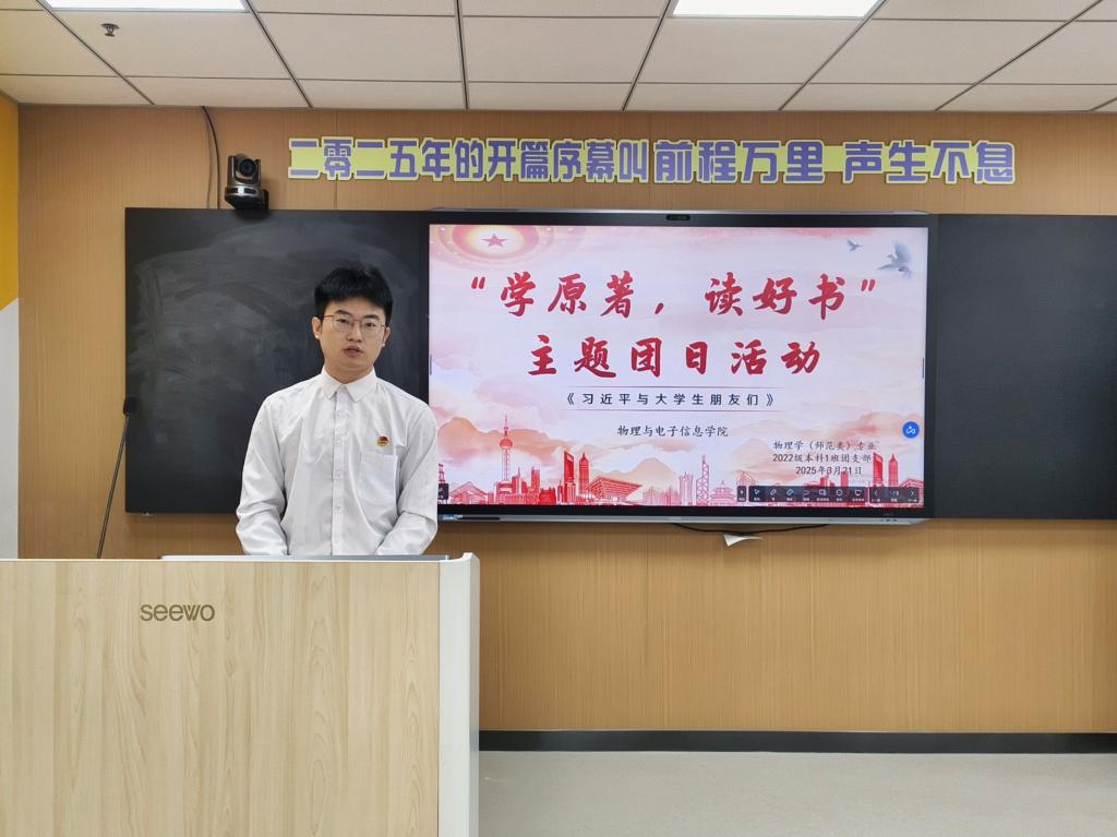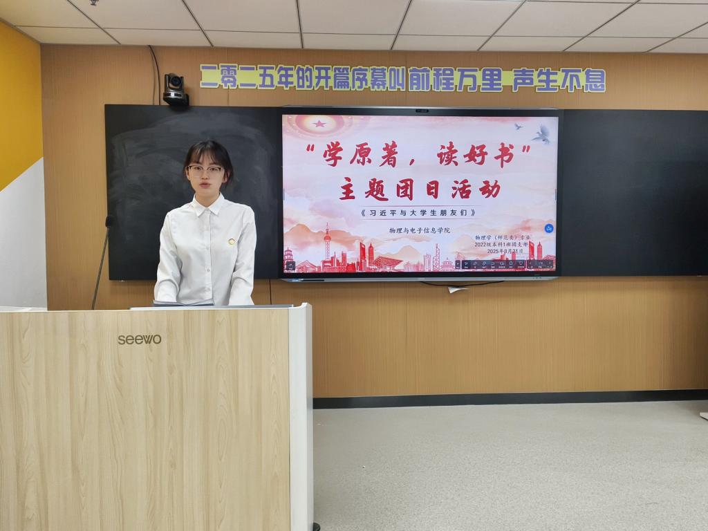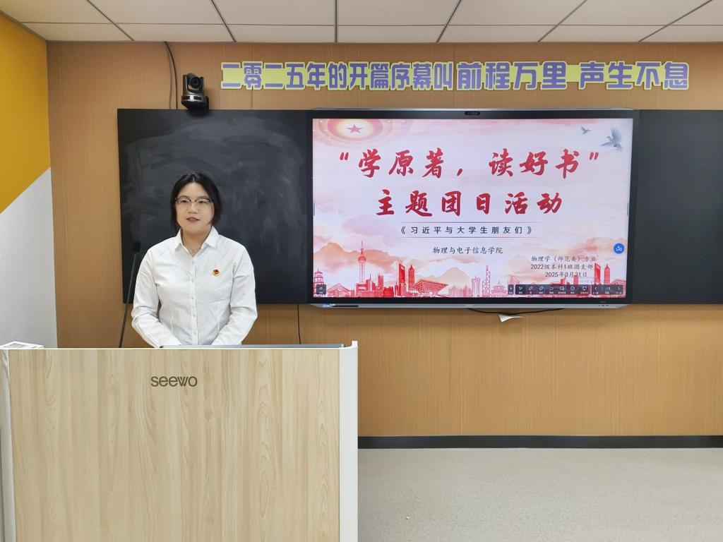 会前,物理学(师范类)2022级1班团支部开展“学原著,读好书”主题团日活动,主题团日读书交流会以《习近平与大学生朋友们》为学习载体,通过"领学+研讨"双轨模式展开。团支书记系统解读经典著作中青年实践育人的核心章节,结合乡村振兴战略阐释新时代青年的责任担当。随后,三名学生代表结合读书感悟,立足支教实习经历,上台分享了实习实践感悟。最后,全体团员围绕“寄语未来,共筑新程”为主题展开职业规划研讨,将个人成长融入强国建设,形成理论实践深度互促的教育新范式。