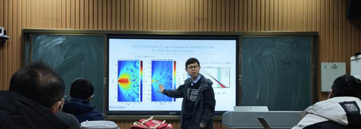 乔二林研究员系统阐述了黑洞潮汐瓦解事件(TDE) 这一时域天文学前沿课题。他从观测现象入手,深入剖析了恒星被黑洞潮汐力撕裂、物质吸积并产生剧烈辐射的全过程物理机制,并重点分享了其团队在超爱丁顿吸积过程的理论建模与数值模拟方面的最新研究进展。乔研究员的报告逻辑清晰、深入浅出,为听众理解黑洞周围极端环境下的物质行为打开了新的窗口。