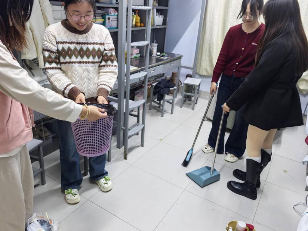 内务指导环节“X舍友”走进学生宿舍,示范床铺整理技巧,并演示书桌收纳的分类,明确宿舍卫生与内务标准,引导学生养成井井有条的生活习惯。