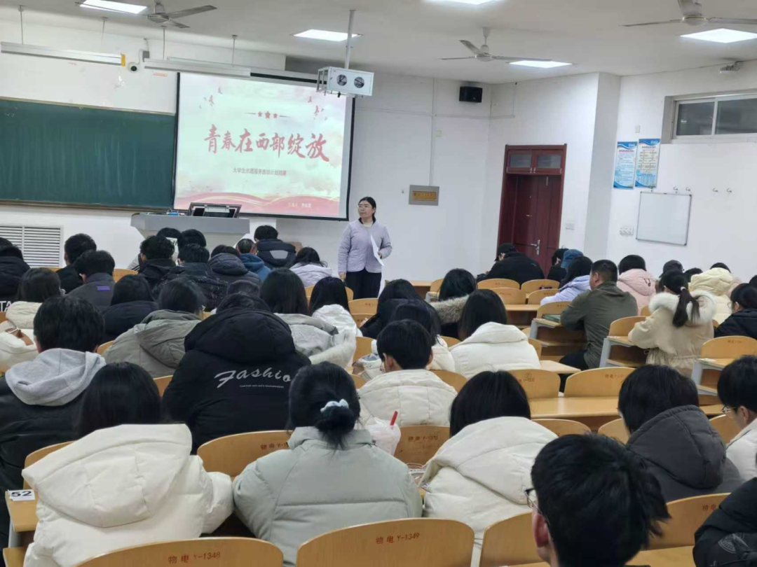 宣讲会上,学院党委副书记刘秀华围绕西部计划招募条件、服务保障、发展支持等核心政策展开解读,清晰阐释了志愿者服务期间享有生活补贴、医疗保障,服务期满后可享受考研加分、公考优先录用等优惠。她强调,西部计划为青年提供了成长成才的重要平台,学校与学院将为志愿者提供全方位支持,解除大家的后顾之忧,鼓励学子们把握机遇,到西部广阔天地实现人生价值。志愿者分享环节,马守健讲述了用知识与爱心助力基层教育发展的初心与收获;季心怡则畅谈了在西部基层治理与民生服务中的实践体会,传递了扎根一线、奉献担当的青春态度。两人的分享质朴真切,让在场学子直观感受到西部计划的价值与意义。