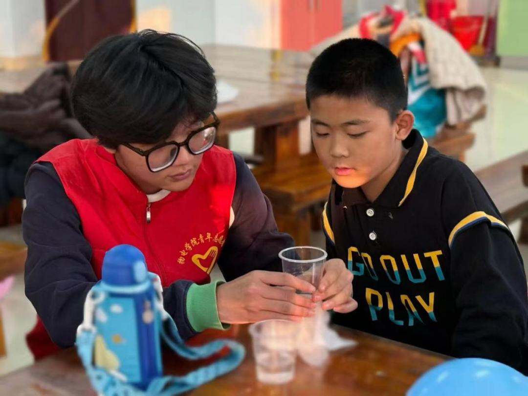 活动现场,“扎不破的气球”“火箭发射”“喷泉实验”三项趣味实验依次精彩呈现:当裹着洗洁精的牙签轻刺入气球却未使其破裂时,孩子们发出阵阵惊呼。志愿者们以一对一指导的方式,带着大家动手操作“火箭发射”装置,在反冲力的推动下,“小火箭”腾空而起,现场欢呼声不断。通过通俗的讲解,孩子们在动手实践中解锁了弹性形变、气压差等物理原理。临近活动末尾,志愿者们鼓励孩子们主动分享心得体会, 不少孩子主动展示实验成果,眼中满是对科学的好奇与热情,充分展现了孩子们对科学的浓厚兴趣。
