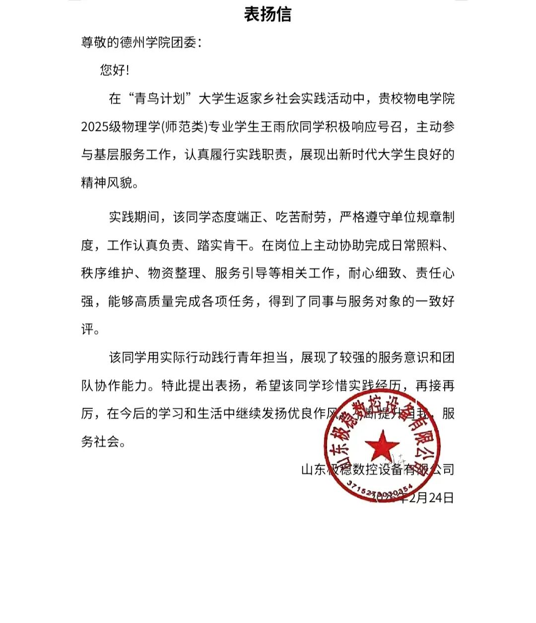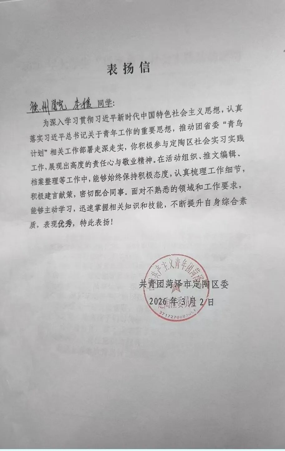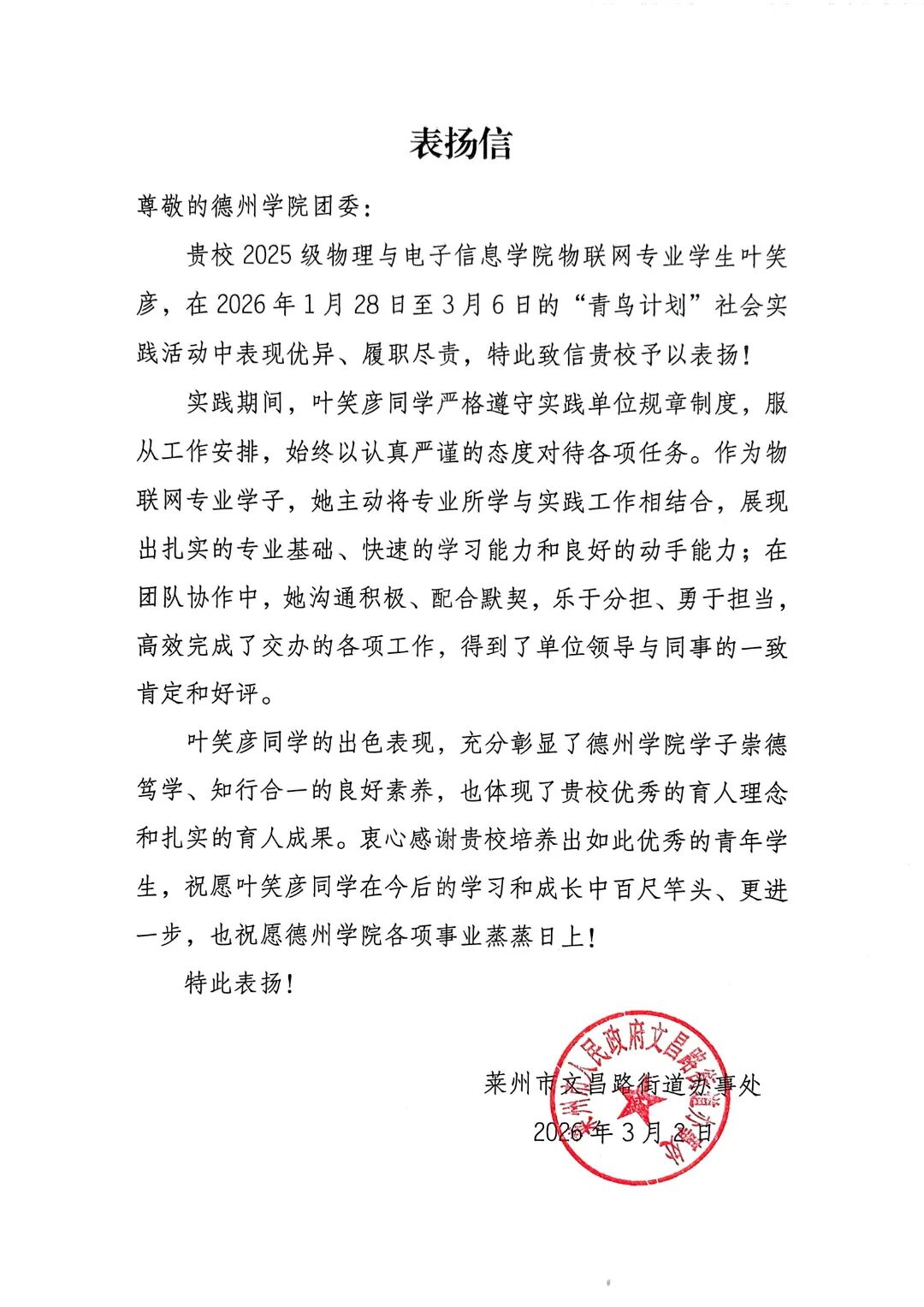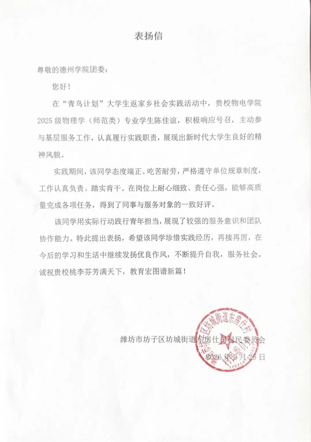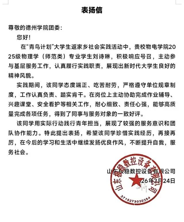用实际行动贡献青春力量,于家乡热土书写青年担当。2026年寒假期间,太阳网集团tcy8722广大青年学子积极参与“返家乡”社会实践活动。他们走进政府机关、社区、街道办事处等实习岗位,踊跃投身于科技创新、乡村振兴、绿色发展、社会服务等各领域各方面工作,在扎根基层实践、助力家乡发展中受锻炼、长才干、显担当。同学们在实践中的优异表现,获得了各实践单位的充分肯定,陆续收到多封感谢信。这些“暖心回应”的背后,是同学们实践成效与家乡发展需求的同频共振。