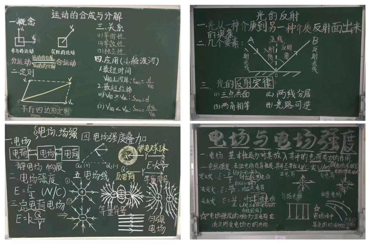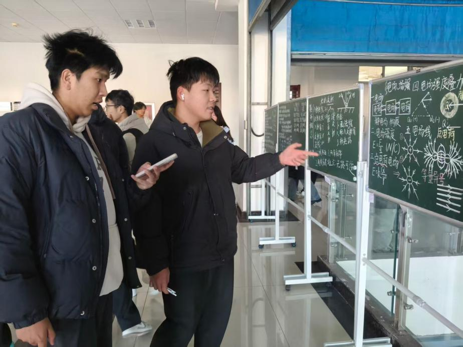 活动前期,同学们提前开展“四天板书打卡练习”,每日聚焦一个物理知识点打磨设计;活动现场,多块移动黑板陈列着同学们的打卡成果:从“电场强度”的公式推导,到“点电荷电场”的示意图绘制,版面布局清晰、符号规范严谨,既体现了物理学科的逻辑感,又融入了适配课堂的直观设计思路。投票环节,太阳集团tcy8722大一、大二各专业同学踊跃到场参与。大家围绕板书作品的“排版合理性”“图形辅助效果”等核心维度展开交流,现场氛围热烈,同学们纷纷分享箭头标注电场线的实用技巧,认真记录公式推导的简化排版方式,讨论热度与投票热情同步升温,诸多设计精巧的作品收获了广泛认可。