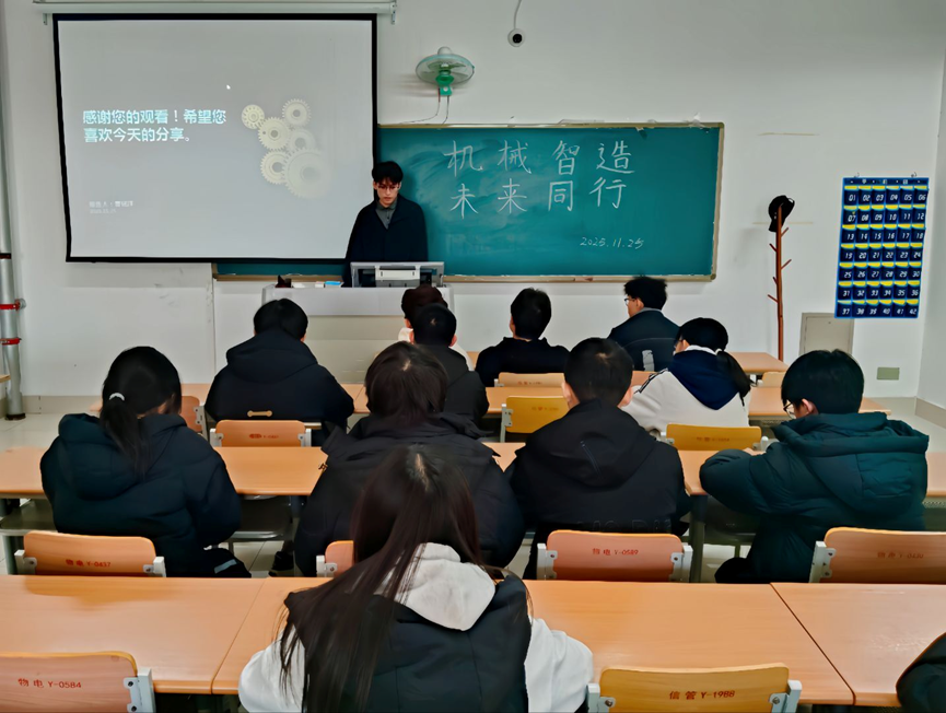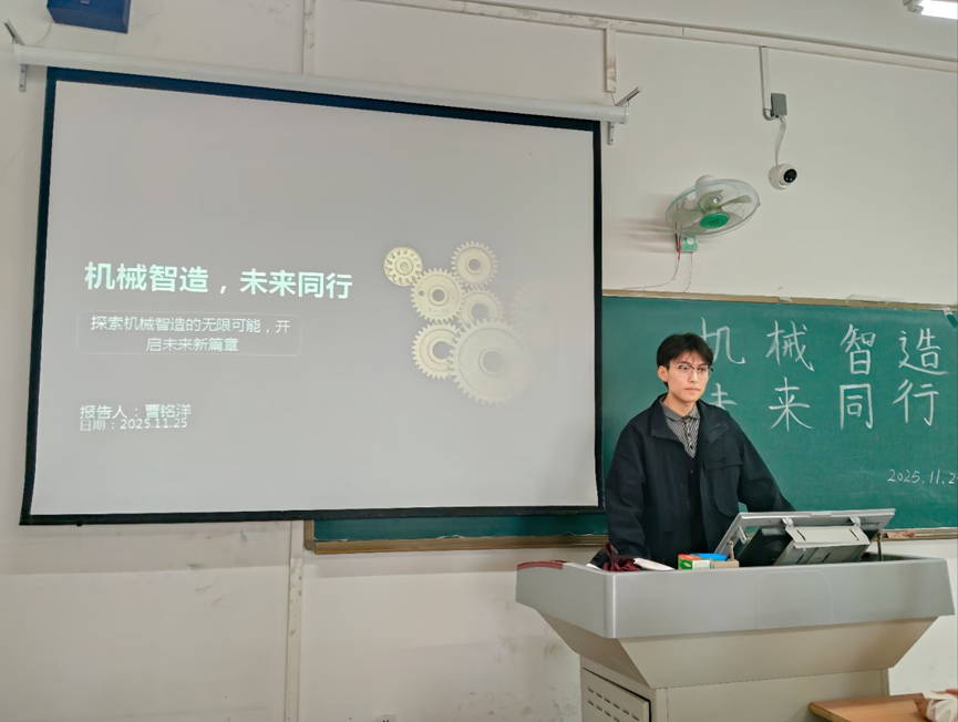 活动中,曹铭洋围绕机械智造概述、应用领域、核心技术、发展历程及未来趋势五大模块展开分享。他从机械智造的定义与高效性、精准性等核心特点切入,以时间线为轴,梳理了从早期机械化生产到智能化制造时代的演进脉络;同时结合汽车自动化装配、手术机器人诊疗、智能家居联动等多领域实例,搭配图文并茂的演示,解读人工智能融合、产业跨界赋能等前沿方向,让同学们直观感受机械智造的应用价值与发展潜力。现场学习氛围浓厚,同学们专注聆听、积极互动,沉浸于机械智造的科技魅力之中。
