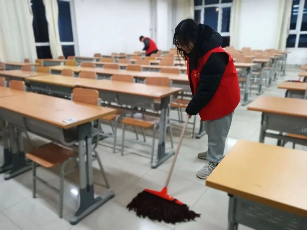 活动中,志愿者们分工明确、相互配合,用抹布和清洁剂等工具擦拭教室玻璃、课桌和墙壁,及时清理角落杂物防止病菌滋生,并开窗通风保持空气流通,同时仔细清扫走廊、卫生间地面的纸屑和垃圾,确保教学楼内干净整洁。在志愿者们的共同努力下,教学楼变得整洁靓丽、焕然一新。