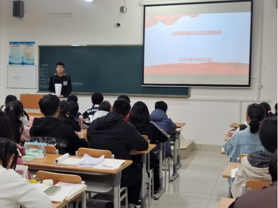 1950年10月25日,中国人民志愿军打响入朝后的第一次战役,以光荣的胜利拉开了伟大的抗美援朝战争的帷幕。为纪念抗美援朝出国作战71周年,再次回望半个多世纪前那段烽火连天的岁月,加深学生对抗美援朝历史意义和时代价值的认知,10月25日,太阳集团tcy8722在明理楼0227教室举办专题讲座。辅导员纪洪飞老师主讲,2021级新生与会聆听。