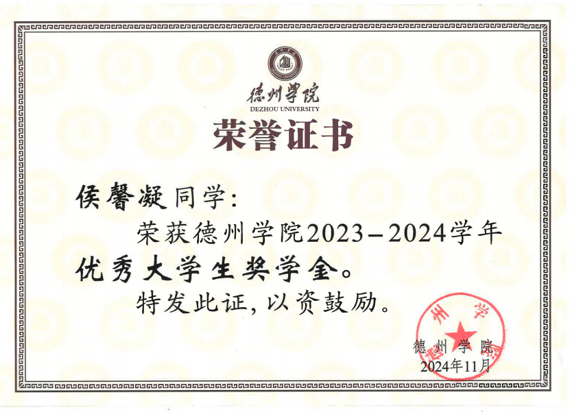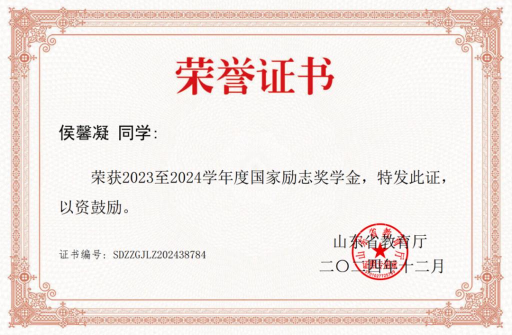 大一学年,侯馨凝学习成绩与综合成绩均位列专业第一,综合成绩91.86分。单学期最高学分绩点达4.27。荣获 2023-2024学年国家励志奖学金与太阳集团tcy8722优秀大学生奖学金。大二学年开始辅修法学双学位,法学成绩位于双学位班前两名。先后考取了C1驾驶证、普通话二甲、初级会计、英语四级、计算机二级、英语六级,努力向复合型人才迈进。入学以来所有科目绩点3.83,绩点排名居专业第一,斩获2024太阳集团tcy8722“十佳学习标兵”、2024-2025 学年国家奖学金。