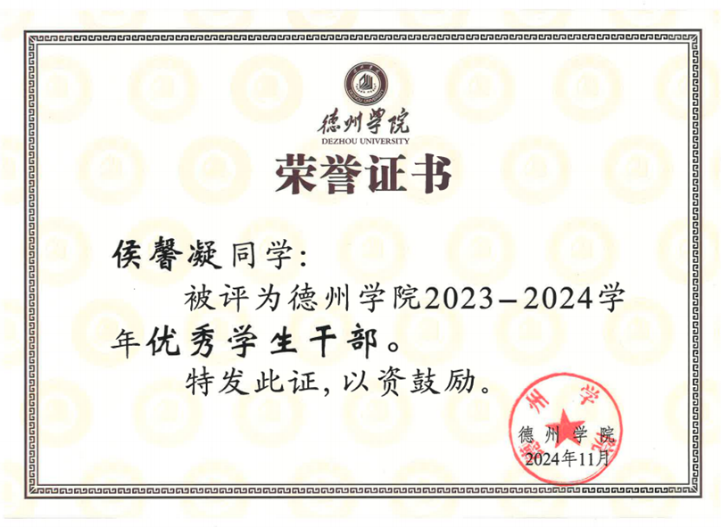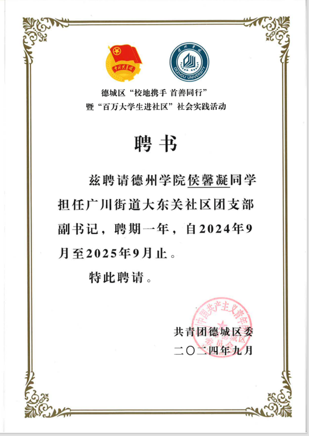 她曾在“一站式”学生社区与事务发展中心担任活动部干事,参与各类活动的组织策划;同时热爱志愿服务,多次参与学院青志部活动,并动员团支部团员投身志愿工作;担任过德城区广川街道大东关社区兼职团干部,搭建学校与社区的沟通桥梁。参与2025大学生返家乡社会实践,服务于平度市环境生态局。2025年 4月,在学院统一安排的综合工程实训中表现出色,获评优秀学员。侯馨凝积极参与运动会、越野赛、辩论赛、演讲比赛等各类文体活动,多次荣登太阳集团tcy8722官方公众号、传递榜样力量、书写多维青春。